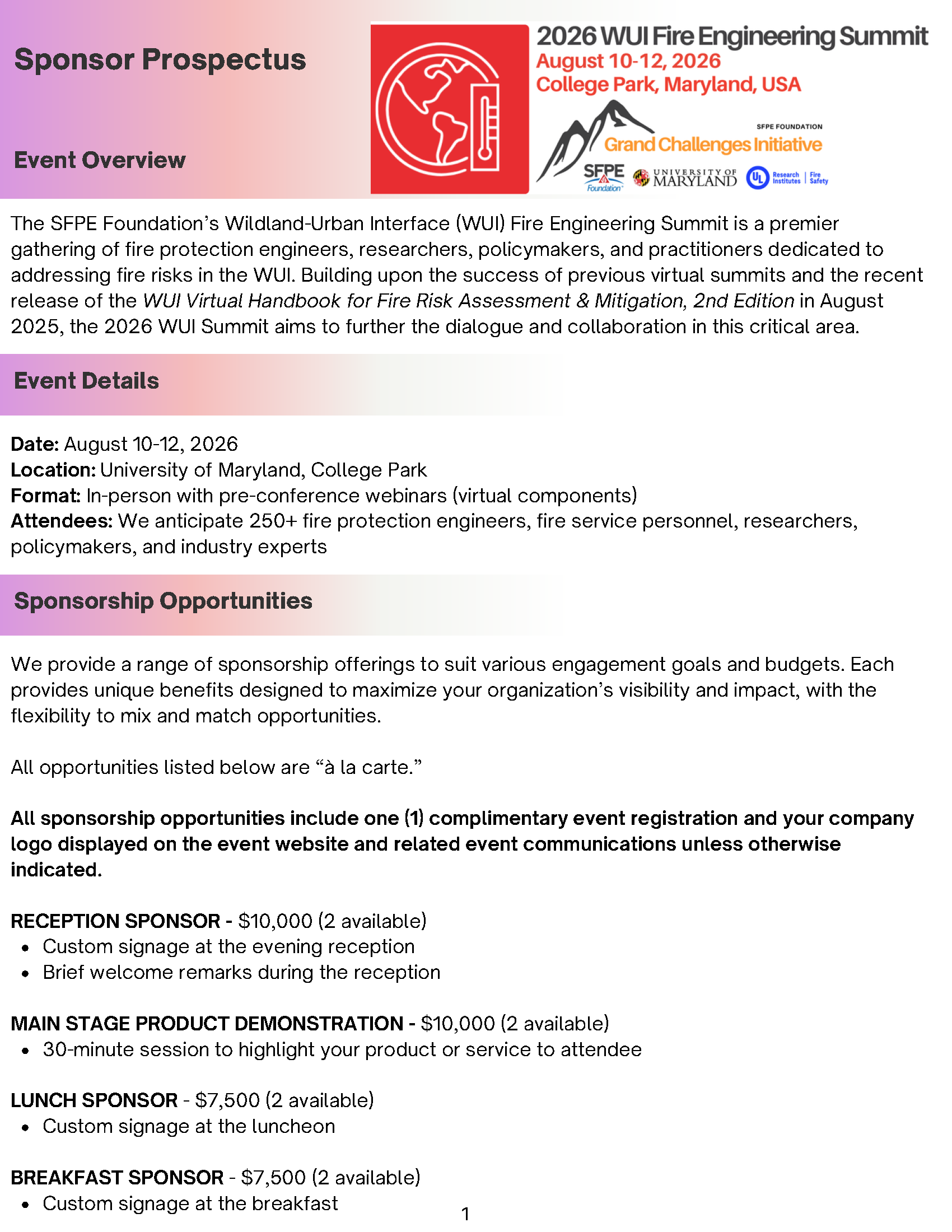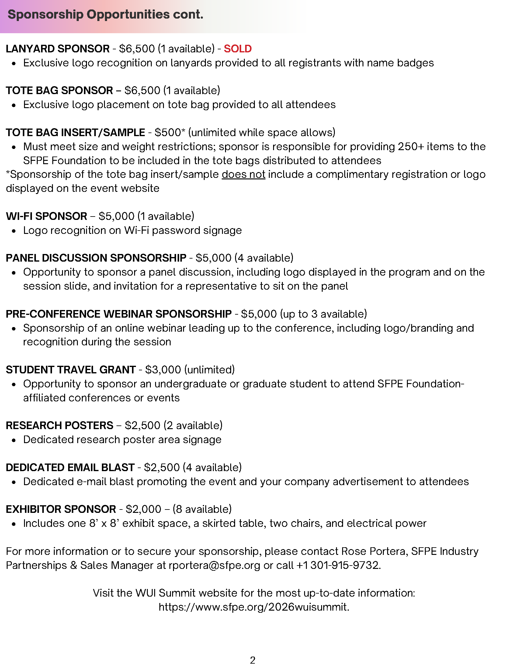 View Sponsor Prospectus HereSponsor Order Form Sponsorship opportunities exist. Contact Rose Portera at rportera@sfpe.org for more information.