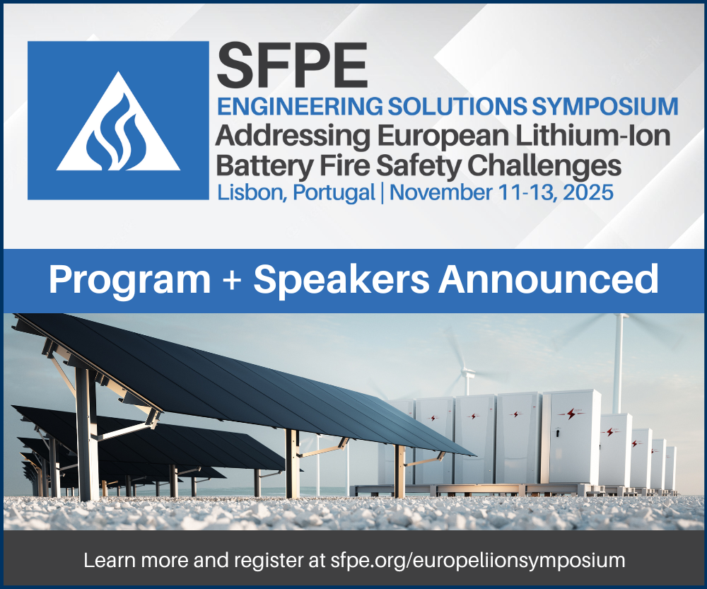 To learn more and to register for the SFPE Engineering Solutions Symposium: Addressing European Lithium-Ion Battery Fire Safety Challenges, visit www.sfpe.org/europeliionsymposium today.