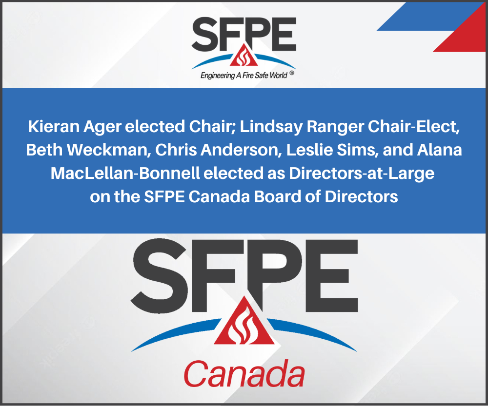 SFPE Canada: Kieran Ager elected Chair; Lindsay Ranger Chair-Elect, Beth Weckman, Chris Anderson, Leslie Sims, and Alana MacLellan-Bonnell elected as Directors-at-Large on the SFPE Canada Board of Directors