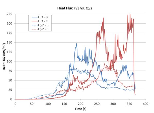 Table 1 lists a comparison of the times that events occurred in the full scale and quarter scale experiments. Figure 4 – Figure 6 show a summary of the data comparison between FS3 and QS2 experiments. These fires were allowed to burn with steady flames out of the door for approximately two minutes prior to extinguishment.