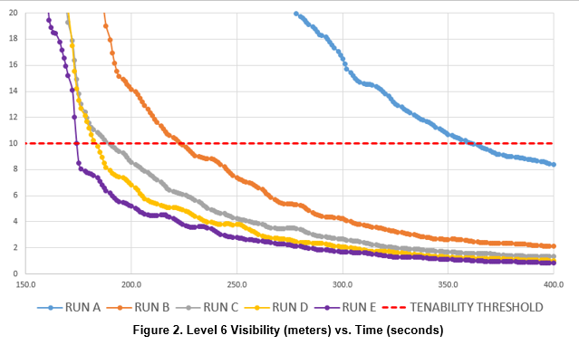 In a typical smoke control analysis, the performance of a smoke control system is evaluated against agreed upon tenability limits of visibility, temperature, and carbon monoxide (CO), measured six feet above any walkable surface in the smoke control zone. For the majority of analyses, visibility conditions are the criteria to first provide a failing condition in a space. For the purpose of this analysis, visibility conditions were utilized to evaluate the influence of varying fuel load compositions. Visibility conditions below 10 meters were considered failure in this analysis.