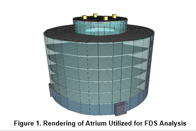 An analysis was conducted through the use of Fire Dynamics Simulator (FDS) to evaluate the effect of varying fire characteristics on model results. A six-story atrium was built in FDS to evaluate how fuel load composition would affect occupant tenability throughout the space. A rendering of the atrium utilized for this analysis is provided in Figure 1.
