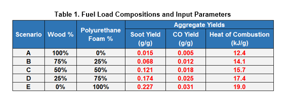 Table A.39 of the SFPE Handbook of Fire Protection Engineering, 5th Edition provides material properties of many natural and synthetic materials commonly utilized in products and furnishings that comprise fuel loads. Although common fuels are composed of numerous materials, this analysis examined wood (pine) and flexible polyurethane foam (GM23) for simplicity. The design fire input parameters within FDS that are of greatest importance for a tenability analysis are the soot yield, CO yield, and heat of combustion of a material. Table 1 demonstrates how varying the fuel load composition (by mass) of the two materials being evaluated in the models affects these input parameters.