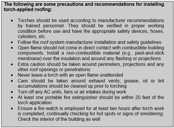 Clearly, using an open flame for torch-applied roofing systems creates unique fire risks, and specific precautionary measures must be taken. There are many documented fires that have caused extensive property damage, two of which are discussed below.