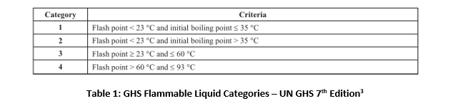 This section may also identify the United Nations (UN) Globally Harmonized System (GHS) hazard classifications. It is important to note that the GHS hazard class definitions vary from most model code hazard definitions. The GHS classifications may vary from the fire code but will advise the reviewer of the possible fire code hazards to investigate and identify throughout the remaining sections of the SDS. For example, the GHS classification may identify the material as a “Flammable Liquid – Category 2”. The UN GHS System of Classification and Labelling of Chemicals also known as the “GHS Purple Book” is a valuable resource to determine the UN Categories for GHS hazard classifications. The example above “Flammable Liquid – Category 2” can be identified below: