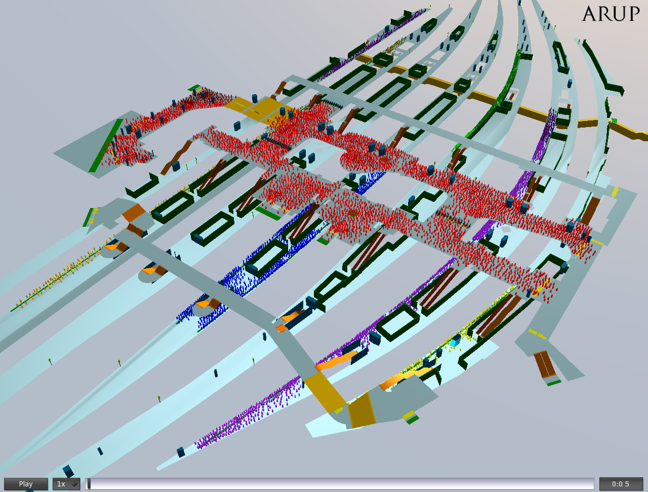 A key part of the project was refurbishing all 12 sub-surface platforms below the station concourse. As portions of platforms were closed off from public use, train services were re-routed to the adjacent platforms. It became evident that simple egress calculations for the high populations and ever-changing conditions were not sufficient for identifying risks such as pinch points and converging exit routes with respect to crowding and queuing.