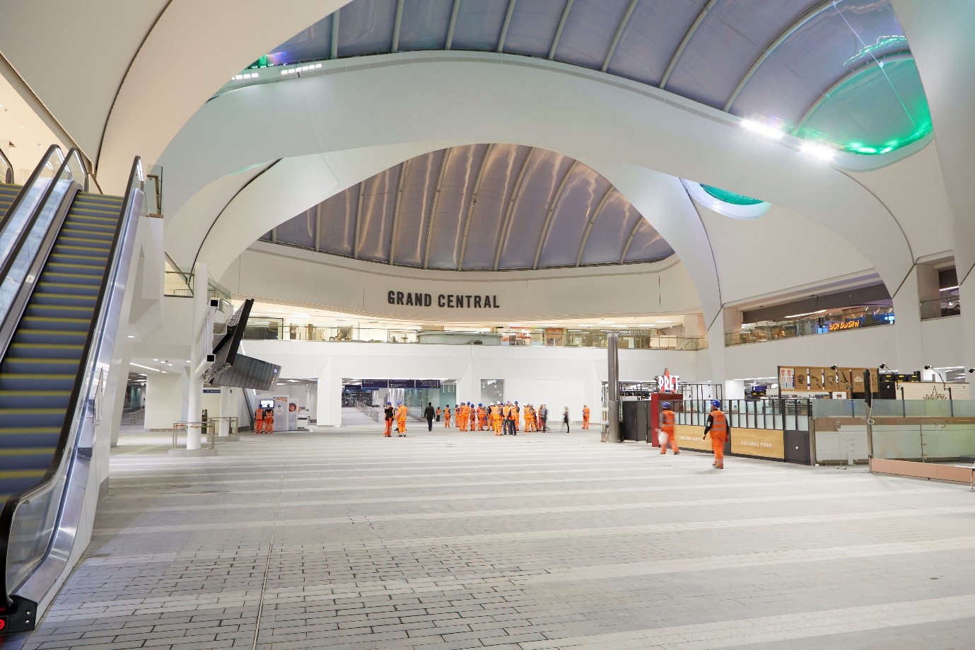 Subsequently, two levels of the construction site at the shopping centre retail level and station concourse (connected via a large atrium) were directly open to the operational station and platforms.