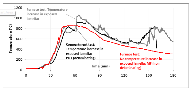 The report also showed that the temperatures measured in the CLT at different depths generally corresponded well between both tests if the same CLT was tested. Figure 3 shows temperatures in CLT at a depth of 20 mm (measured from the exposed surface) for three different tests. The temperatures of the compartment test and the furnace test with PU1 adhesive followed a similar trend and values. Both tests involved a significant increase in temperatures measured in the exposed lamella at around 60 minutes, indicating that delamination took place in both tests.