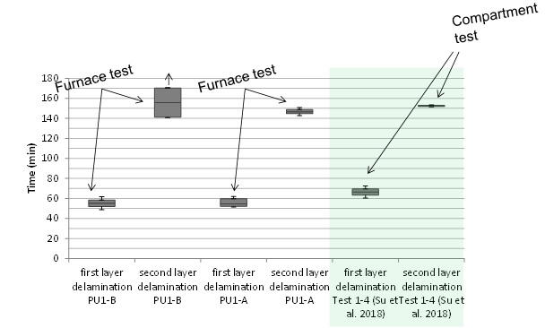 It should be noted that the temperatures were measured in 12 locations in the exposed lamella and that there was a variation in times at which this significant temperature increase took place. Figure 4 shows box plots indicating this variability. The times at which temperature increases occurred in the CLT of the furnace tests were approximately similar to those in the CLT of the compartment test, indicating that the fire exposure is comparable.