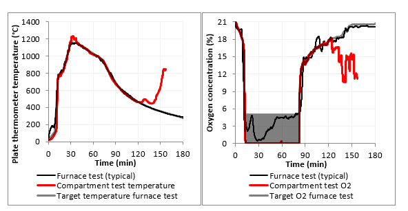 The implemented plate thermometer temperatures and oxygen content were replicated from the full-scale compartment fire tests during the first 120 minutes of the test. To achieve this, the oxygen content was adjusted by adding nitrogen or regular air into the furnace through an inlet, when needed.