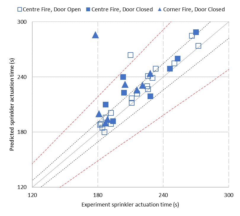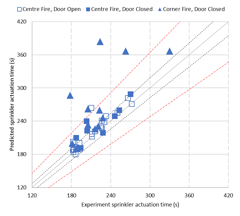 For a capped fire, per Figure 3(b), all sprinkler heads are actuated in the simulations. However, in the corner fire cases with the door closed (Experiment 16 to 22), FDS is less-accurate and over-predicts the actuation time by as much as 108 s.