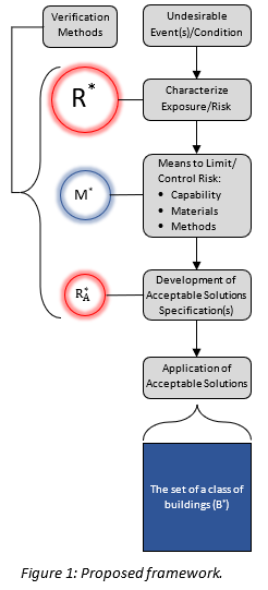 The proposed framework is structured to facilitate the identification of the performance/risk factors currently implicit to the acceptable solution requirements in the NBCC based on a historical analysis of the development (re-development) of the acceptable solution requirements. The proposed methodology to achieve this, summarized in Figure 1, includes the following: