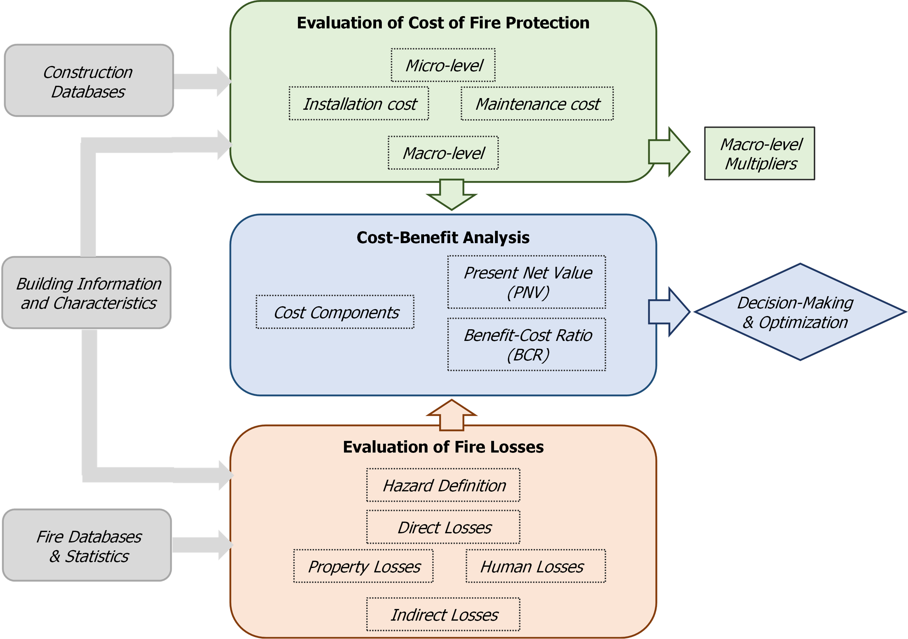 The assessment of the cost effectiveness of fire protection features in buildings requires the capability to quantify (i) the investment cost of these features and (ii) the averted fire losses from the presence of these features. Besides, (iii) a method is required to compare these cost components. Therefore, the project started with a literature review focused on these three key components: