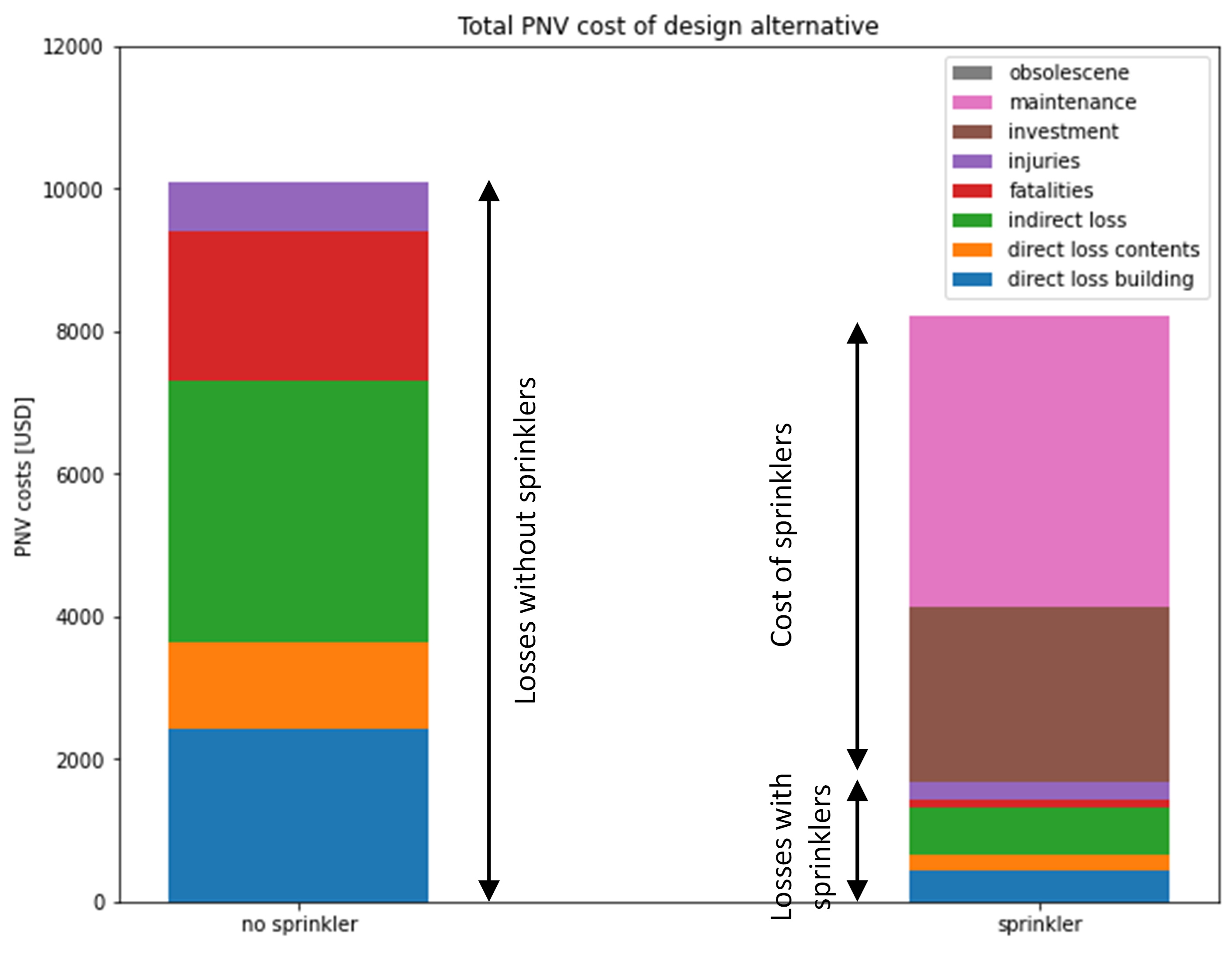 The calculation in the case study of sprinklers in the single family house shows that the presence of sprinklers reduces the (statistical, lifetime) fire-induced losses by $8,400, while the total cost of having the sprinklers (investment and maintenance over the life of the building) is $6,500. The PNV is thus positive ($8,400-$6,500 = $1,900) and the investment in sprinklers is recommended in this example. Figure 2 shows the breakdown of the cost components in the PNV evaluation. Since the PNV of the reduction in losses obtained from the sprinklers exceeds the PNV cost of the sprinklers, the sprinklers are cost-effective.