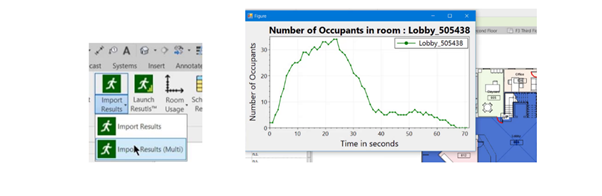 After running the evacuation simulation (in Pathfinder), the results can be loaded into Revit using a dedicated command. The results are saved and can be displayed to the user, as shown in Figure 4. The add-in can also animate some of the results directly within Revit including, at various time steps: door flow rates, number of occupants remaining in a room and the density of a room.
