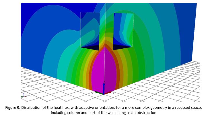 Three wind-deformed shapes of flame zone were analyzed to study the impact on the neighboring building. Critical heat flux on the façade was exceeded only in the most unfavorable wind case. As a result, these areas need to be of adequate fire resistance. An additional more detailed study was performed to establish whether the walls of the recessed balcony need protection. The heat flux distribution in Figure 9 shows that the critical heat flux is not exceeded in these areas. Note that for this additional measurement the column and both side walls were defined as both receiving and obstructing.