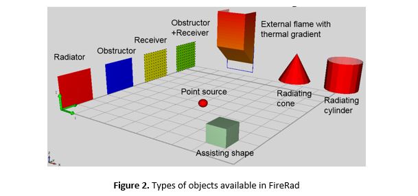 The basic shapes available in the program include several flat surface types (radiating, receiving, obstructing, obstructing/receiving), several 3D objects (external radiating flame with thermal gradient, radiating cone, cylinder) and a point source as the simplest form of a radiating object (Figure 2). The user can specify the properties of each object interactively (e.g., by adjusting dimensions, location, temperature, heat flux, emissivity). The external flame with thermal gradient is based on Eurocode procedure, so to use such an object, the user must define the fire compartment (size, openings, fire load density) to establish flame size, compartment temperature and flame temperature. The more complex objects have several additional parameters such as deformation or number of sectional divisions. The assisting shape (Box 3D) can be used to quickly build the basic geometry of the building from several boxes of different shapes, sizes and rotations. Holes and recesses can be quickly created using Boolean algebra. Every object can be positioned, moved, rotated and copied into a matrix.