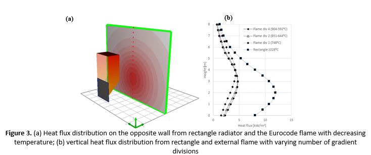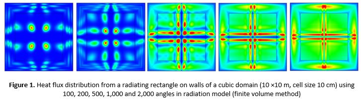 Another problem lays in radiation models implemented in CFD codes, which often involve intensive calculations. Unfortunately, simple tests reveal numerical weaknesses leading to unrealistic heat flux distributions for insufficient spatial and angular resolutions in popular CFD packages (see Figure 1). At best, the engineer must accept the fact that precise radiation calculations increase computation time significantly, not to mention a long duration of a fully developed fire. Another aspect that may be an obstacle is rectangular meshing, which may not resolve properly parts of façades that are not perpendicular in shape. These drawbacks make CFD currently rather unpractical for a quick heat flux assessment involving several geometrical configurations.