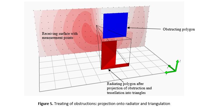 Ability to use obstructions is an important feature of the FireRad. Every polygon defined as an obstruction is obstructing the passage of radiation to a carefully calculated degree. It is implemented by projecting each obstructing polygon on all radiators from all measurement points. If an obstructing radiator creates a shading, then the radiating polygon has to be modified by removing the shaded area. The remaining part of the radiator is tessellated into triangles. This concept is presented in Figure 5.