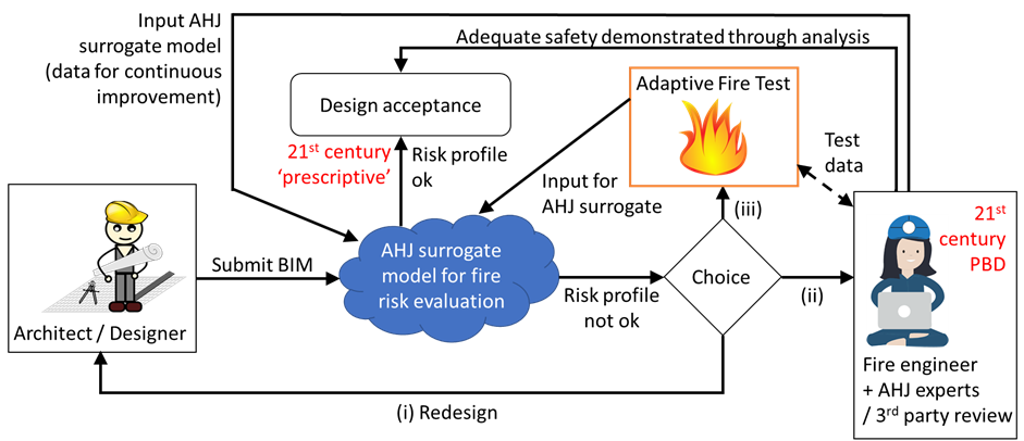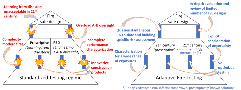 Figure 2 – Fire design acceptance in the 21st century: ‘prescriptive’ design through AHJ-curated surrogate models and PBD informed by comprehensive performance evaluation through Adaptive Fire Testing.