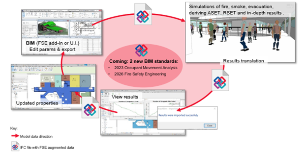 IFC (Industry Foundation Classes)[7] are the international BIM standard file format. Currently two working groups, under the umbrella of buildingSmart International (bSI) are focussed on delivering new standards to support expanded IFC file formats, to support a round-trip FSE workflow, shown in Figure 2.