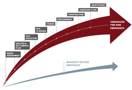 As Figure 2 illustrates, there are opportunities to consider and plan for reducing fire risk within the different stages of preparing for and providing humanitarian assistance in planned camps: fire risk can be considered within needs assessments, shelter and settlement planning, site selection, shelter design, procurement, construction, and in the engagements with the people who live there as the settlement evolves.