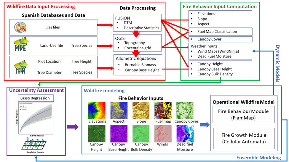 Figure 1. The diagram illustrates a wildfire modeling framework that integrates Spanish forestry data, such as LiDAR, forest inventory, and land-use maps, with data processing techniques to derive fire behavior inputs (e.g., topography, canopy structure, fuel moisture. Uncertainty assessment allow wildfire ensemble modelling to produce fire perimeter/burnt area confidence intervals.