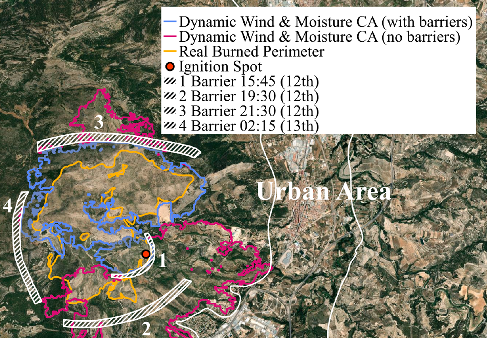 The spatial alignment of suppression barriers with the final fire perimeter indicated that early suppression efforts successfully constrained spread in critical areas. Integrating human intervention in the CA model is mandatory to enhance predictive accuracy particularly in operational settings.