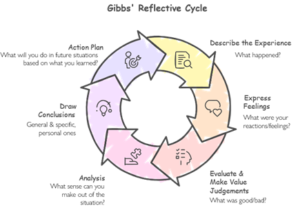“It is not sufficient simply to have an experience in order to learn. Without reflecting upon this experience it may quickly be forgotten or its learning potential lost. It is from the feelings and thoughts emerging from this reflection that generalisations or concepts can be generated.” (Gibbs, 1988)