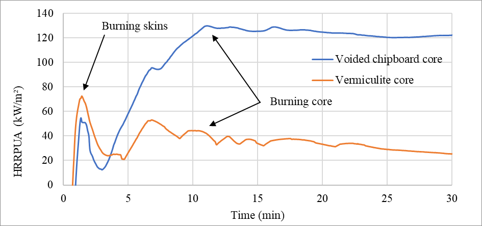 Figure 4 presents the heat release rate per unit area (HRRPUA) calculated for each fire door based on the energy contribution over time. At approximately two minutes, there is a small peak in the HRR; thereafter, the HRR increases to a certain point and remains there until the end of the test. Generally, the core of a fire door is laminated with a combustible skin such as MDF, HDF or commercial plywood, as shown in Figure 5, which presents a cross-section of a typical fire door assembly. In the first three minutes, the skin is heated until it reaches the critical heat flux, resulting in the skin's burning off. Thereafter, the core is exposed to the heat flux in the furnace. Skins produce additional fire load, albeit for a short period and with a low total amount of energy, except that skins produce a localized HRR peak as shown in the graph below. The effect of a combustible core, such as a particle board core, will add a significant amount of additional energy for an extended period. This effect is enhanced when a voided core is used due to the additional surface area of the voids. Additional surface area will increase the total heat release due to the integral of the HRR multiplied by the exposed area. Ultimately, a HRRPUA of 120 kW/m2 for a 2 m2 door leads to a 250 kW contribution to a fire which is not a trivial amount, when design fires may be in the order of 2-5 MW. If there are multiple doors, or double doors, the contribution will increase accordingly.