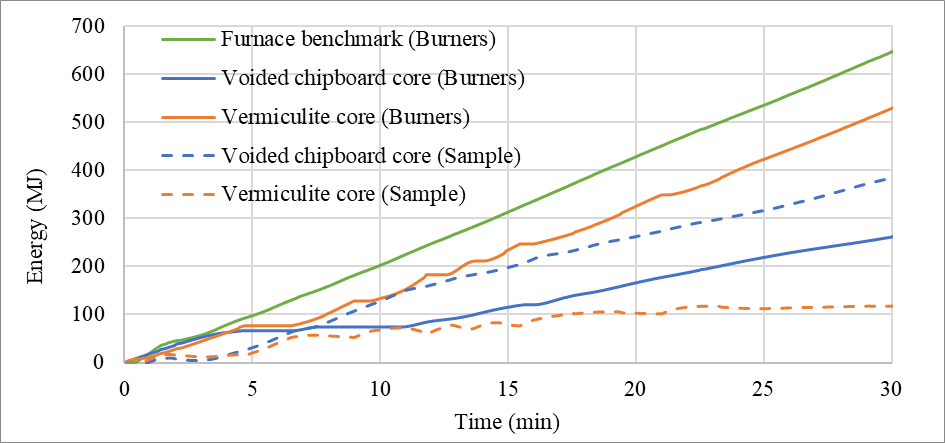 Figure 2 displays the total energy required to heat the furnace to the standard fire curve in three cases: 1) Furnace benchmark – no sample (green), 2) Voided chipboard core – combustible (blue), and 3) Vermiculite core – non-combustible (orange). The furnace is heated with two diesel burners, each with a power range between 100kW and 300kW. The energy input into the furnace is calculated based on the diesel consumption of the diesel burners. The solid lines in Figure 2 display the energy input from the burners for each case. Assuming the benchmark case represents the energy required for no sample heating, the change in energy consumption can be calculated by subtracting each door test's energy consumption from the benchmark test. The dashed line is the difference between the benchmark test and the energy consumption required by the test specimen for each core, respectively. Hence, the dashed curve indicates the total energy that a sample “contributes to the fire”.