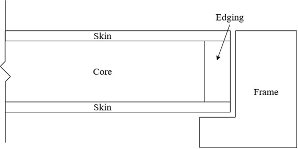 Figure 5: Plan view of a cross-section of a typical fire door assembly. The edging is fixed around the perimeter of the core, and the skins are glued on both faces of the door leaf.