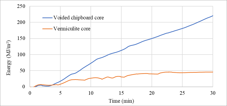 For comparative analysis, the energy contribution per unit area (MJ/m²) for each fire door mentioned above is plotted against each other as shown in Figure 3. From this data, it is clear that the energy contribution for the combustible core is up to four times more than the non-combustible core.