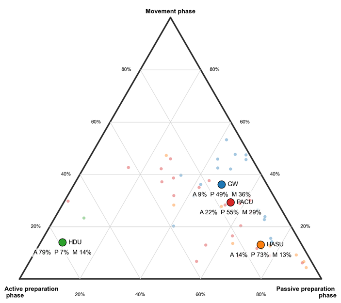 Figure 1: A ternary plot showing how evacuation time is divided into three phases: active preparation (staff actions such as disconnecting equipment), passive preparation (waiting or delays before movement), and movement (purposeful movement toward an exit). Each point represents data from an evacuation drill, with the larger symbols showing the median for each hospital ward type. The plot highlights how different wards face very different challenges: for example, patients in the High Dependency Unit spend most of their time in active preparation (79%), while those in the Hyper Acute Stroke Unit spend the majority in passive preparation (73%). By contrast, general ward evacuations show a more balanced mix across all three phases. Abbreviations: A: Active preparation phase, BP: Passive preparation phase, M: Movement phase, GW: General ward, HASU: Hyper Acute Stroke Unit, HDU: High Dependency Unit, PACU: Post-anaesthesia Care Unit.