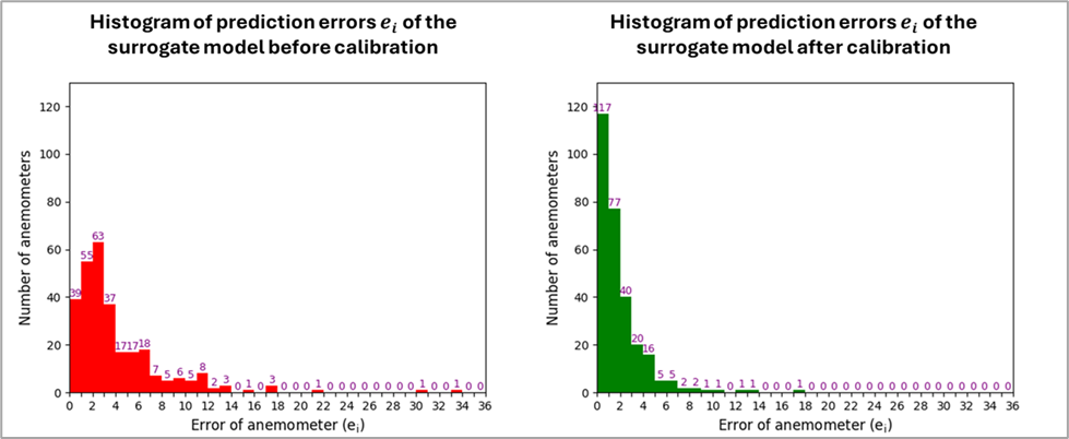 Figure 7. Histograms of the distribution of errors of the surrogate model in the prediction of field data. Left – Before calibration. Right – After calibration.