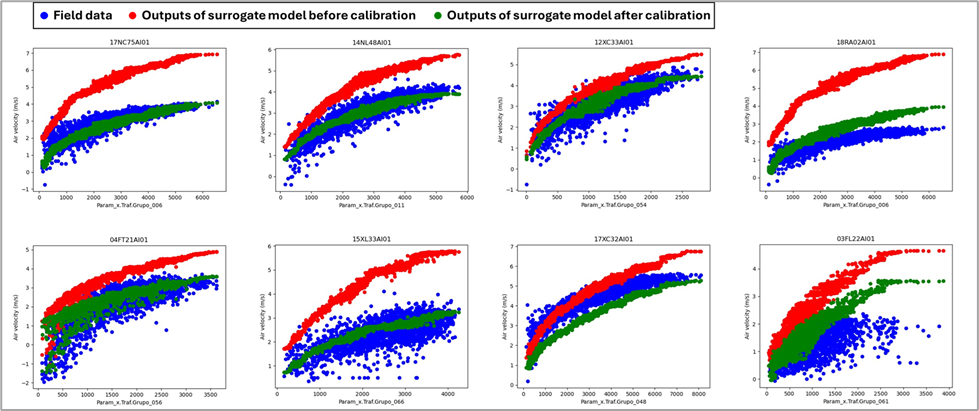 Figure 6. Air velocity (m/s) for different anemometers against the traffic flow (vehicles/hour) in the tunnel segment where the anemometer is placed. Three data sets are represented for each anemometer, field data (blue dots), outputs of surrogate model before calibration (red dots), and outputs of surrogate model after calibration (green dots).
