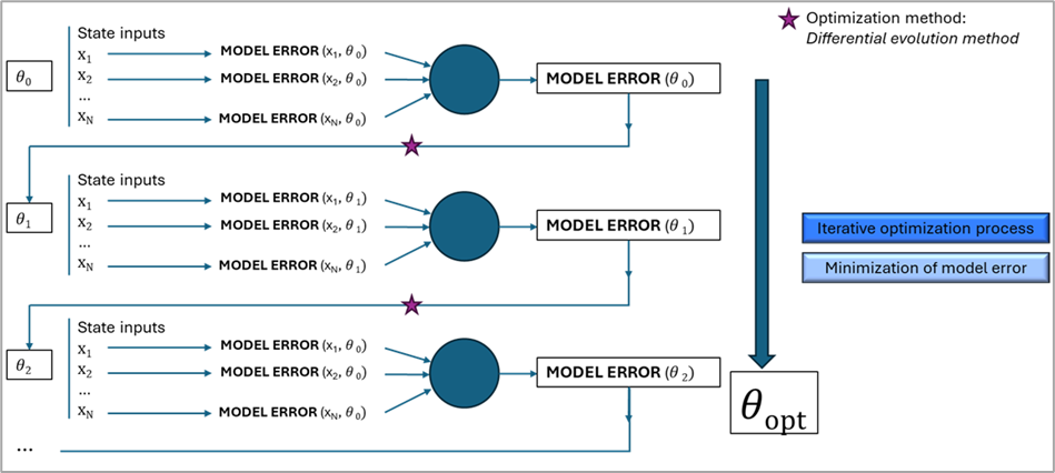 The calibration process consists of an optimization process that aims to find the θ values that minimize this metric. To carry out this task, the calibration process needs to explore the parameter space by comparing simulation outputs with field data across many different combinations of model parameters and state inputs. This exploration seeks the parameter set that provides the best overall agreement with the measurements. Since such an extensive search cannot be performed manually, an automated method is required to efficiently evaluate and refine candidate parameter sets. Achieving this relies on an iterative optimization procedure in which successive candidates are tested and progressively improved until the convergence criteria are met. In this project, a differential evolution algorithm [3] was selected for the optimization process because of its ability to explore high-dimensional parameter spaces effectively and avoid convergence to local minima (global optimization). An overview of this iterative process and its structure within the calibration workflow is shown in Figure 4.