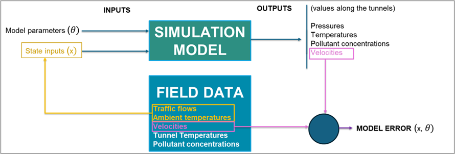 Some of the available field data correspond to state inputs of the model, such as traffic flow and ambient temperature. Other variables measured in the field correspond to model outputs, including air velocity at different anemometers and temperature within the tunnels. This relationship between model inputs, model outputs, and the available field data is illustrated in Figure 3.