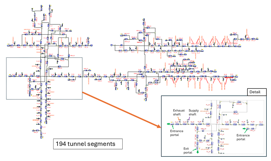 Although three-dimensional fire simulations using Fire Dynamics Simulator (FDS) software were also conducted, these are limited to analyzing smoke movement in localized zones under predefined boundary conditions. They cannot represent the system-wide aerodynamic response to different equipment activation scenarios. A 1D model, on the other hand, can capture global flow balances, pressure losses, heat transfer effects, and interactions between ventilation equipment across the full network. The main objective of this work was therefore to develop and calibrate such a model using field data.