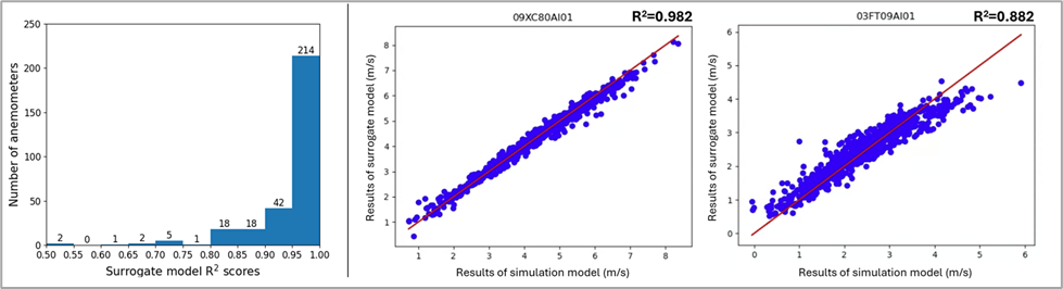 Figure 5. Left - General performance of surrogate model represented as a histogram of R2 scores of the surrogate models of each of the anemometers. Right - Example of performance of surrogate model of two of the anemometers considered. Predictions of surrogate models compared against result of the simulations.