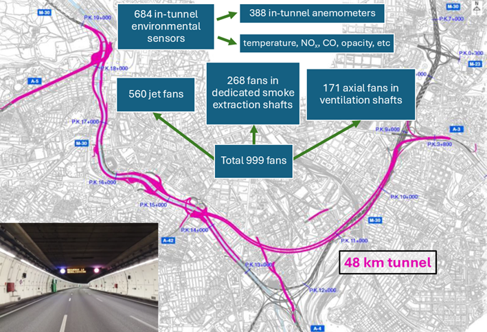 The M30 tunnel network forms a continuous underground ring around central Madrid. It includes 48 km of tunnels, equivalent to 118 km of single-lane roadway, with daily traffic exceeding 1.3 million vehicles. The system incorporates 21 entrances, 22 exits, branching points, and widely varying cross sections. All of these elements contribute to a complex ventilation behavior resulting from the interaction between multiple interconnected tunnels.