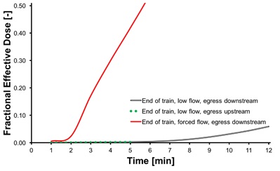 It is clear from Figure 2, below, that the FED due to toxic exposure is considerably greater for those escaping downstream in the ventilated scenario, compared to the low-flow case. Note: FED data are not presented for upstream egress in the ventilated case, since no smoke or heat exposure occurs in this scenario. It is apparent that in the low-flow scenario, even though there is some smoke exposure, the FED values remain very low for passengers leaving the train in either direction.
