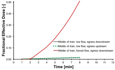 When the fire occurs near to the rear of the train, there are many more people upstream of the fire than there are downstream. However, the few who are downstream are close to the fire when they enter the tunnel and must spend more time in the tunnel to reach a place of safety. The FED data for the first egressing passenger in this scenario are shown in Figure 3, below.