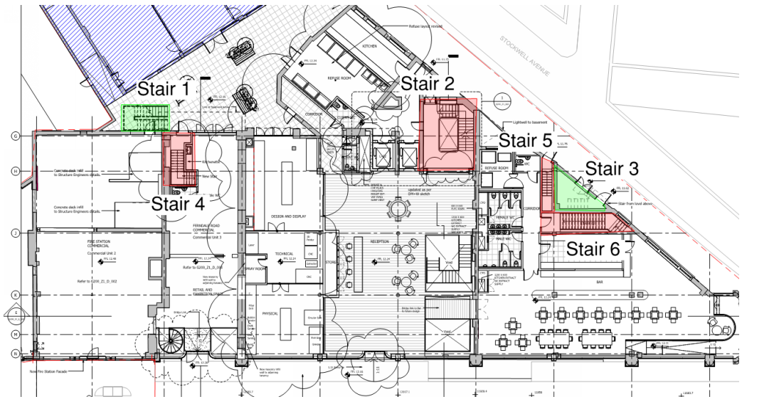 The permitted maximum population should be based on evenly distributed population. A detailed evacuation assessment was carried out to analyse various scenarios, such as evening, when events take place on the bar on fourth floor and/or at basement level. Figure 6 outlines the ground floor level and highlights escape stairs and exit provisions.