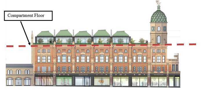 The proposed work on the building involved removing the existing sprinkler system and creating open voids to link various levels. These worsen the situation in terms of external fire spread. A detailed external fire spread assessment was carried out to assess whether a compartment floor or fire-resistant glazing were required for the new design. The best option was for the new floor to be designed as a compartment floor, as shown in Figure 8.