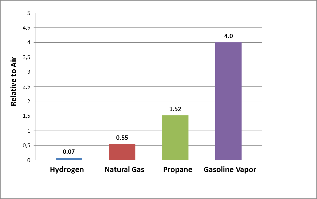 Hydrogen is odorless, colorless and tasteless, so human senses cannot detect high concentrations of this gas. Hydrogen is also lighter than air and diffuses rapidly (diffusion coefficient equals 61.1 10-6 m2/s)2. The graph in Figure 1 shows densities of sample gases relative to the air2-5.
