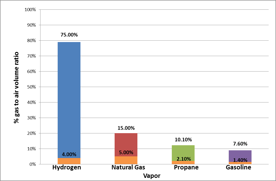 The explosive limits of hydrogen vary between 4% and 74% and also have very significant parameters, in accordance with hydrogen explosive hazards. Figure 2 shows a comparison of explosive range for different flammable gases2-5.