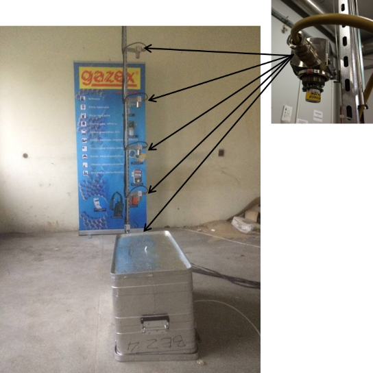 This experiment involved measuring hydrogen dispersion in a small enclosure (20 m3). The real hydrogen gas was fed from a cylinder and supplied to the enclosure through a box imitating a battery. The upper surface of the box had 21 openings of 6 mm diameter each. Hydrogen concentration was measured by using the catalytic sensors at six heights over the emission source. The volume flow of the gas represented a flow similar to that during batteries’ charging process (Figure 3).