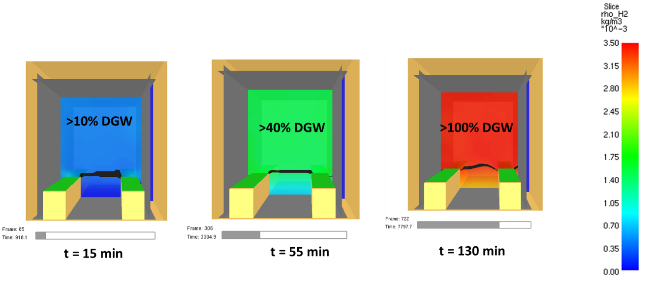 The FDS simulation results presented in Figure 5 confirmed that the increase of hydrogen concentration in the battery room occurs uniformly over the entire enclosure, at a rate similar to the time calculated theoretically. However, because the lower part of the enclosure stays free of hydrogen, the simulated time of increasing hydrogen concentration was a little slower than calculated theoretically. The red color on the scale means the concentration of hydrogen is 100% LEL, which was equal to 3,4 x 10-3 kg/m3.